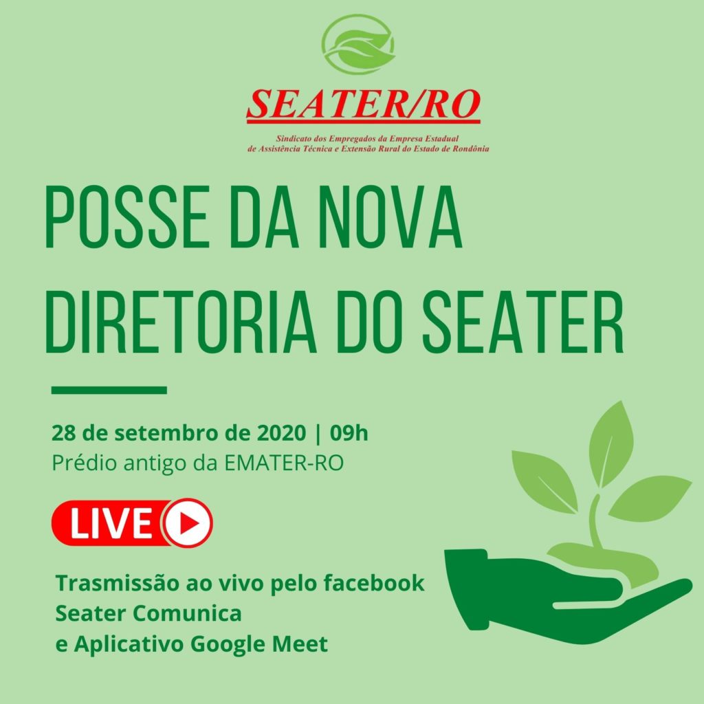 A Diretoria do Seater informa que a posse da nova diretoria acontencerá no dia 28/09 (segunda-feira) às 09h, na garagem da EMATER-RO (prédio antigo).