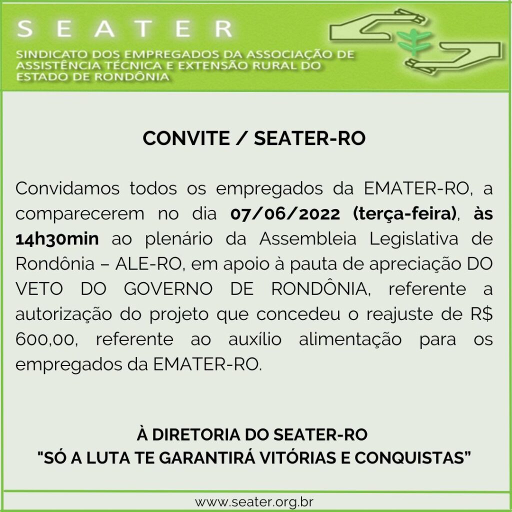Notícias CONVITE – PLENÁRIO DA ASSEMBLEIA LEGISLATIVA 1 de junho de 2022 Daiane Brito Enviamos convite, para todos os empregados da EMATER-RO É a oportunidade dos empregados demonstrarem sua força na luta para concessão desse benefício